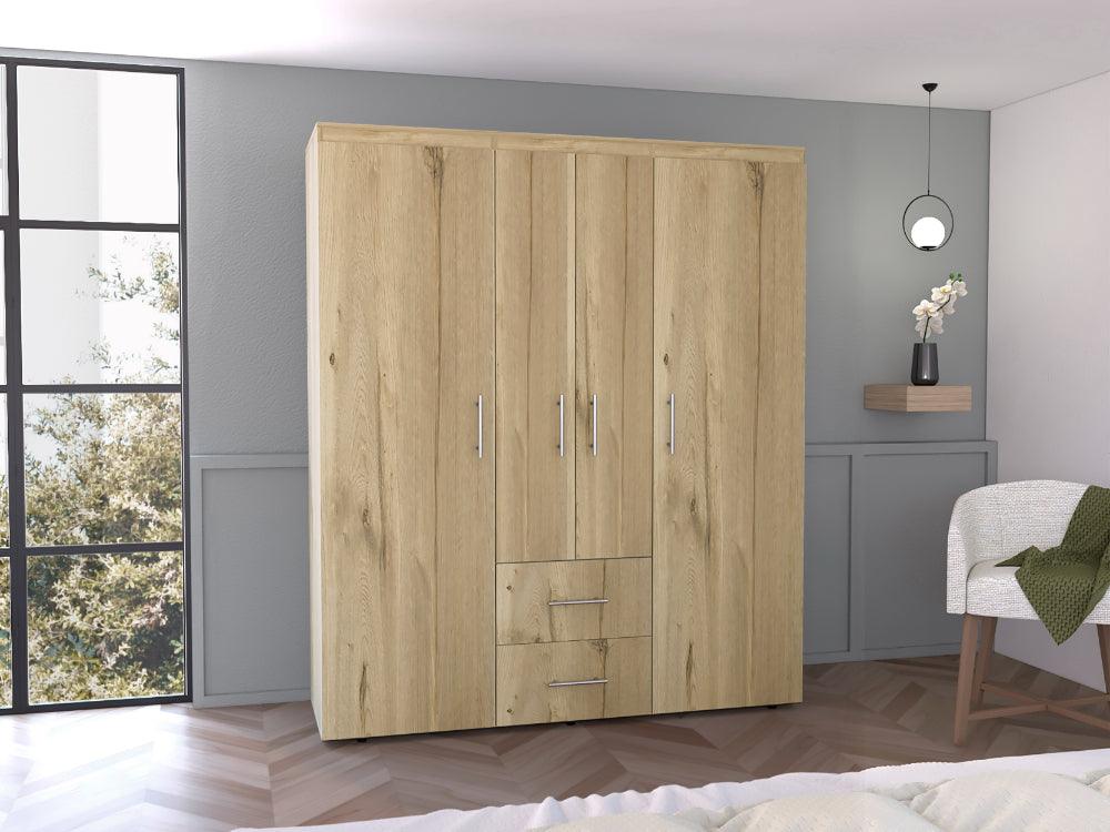 Closet, con cuatro puertas batientes, dos cajones, tres tubos pata colgar ropa y amplios espacios de guardado. Con manijas doradas.