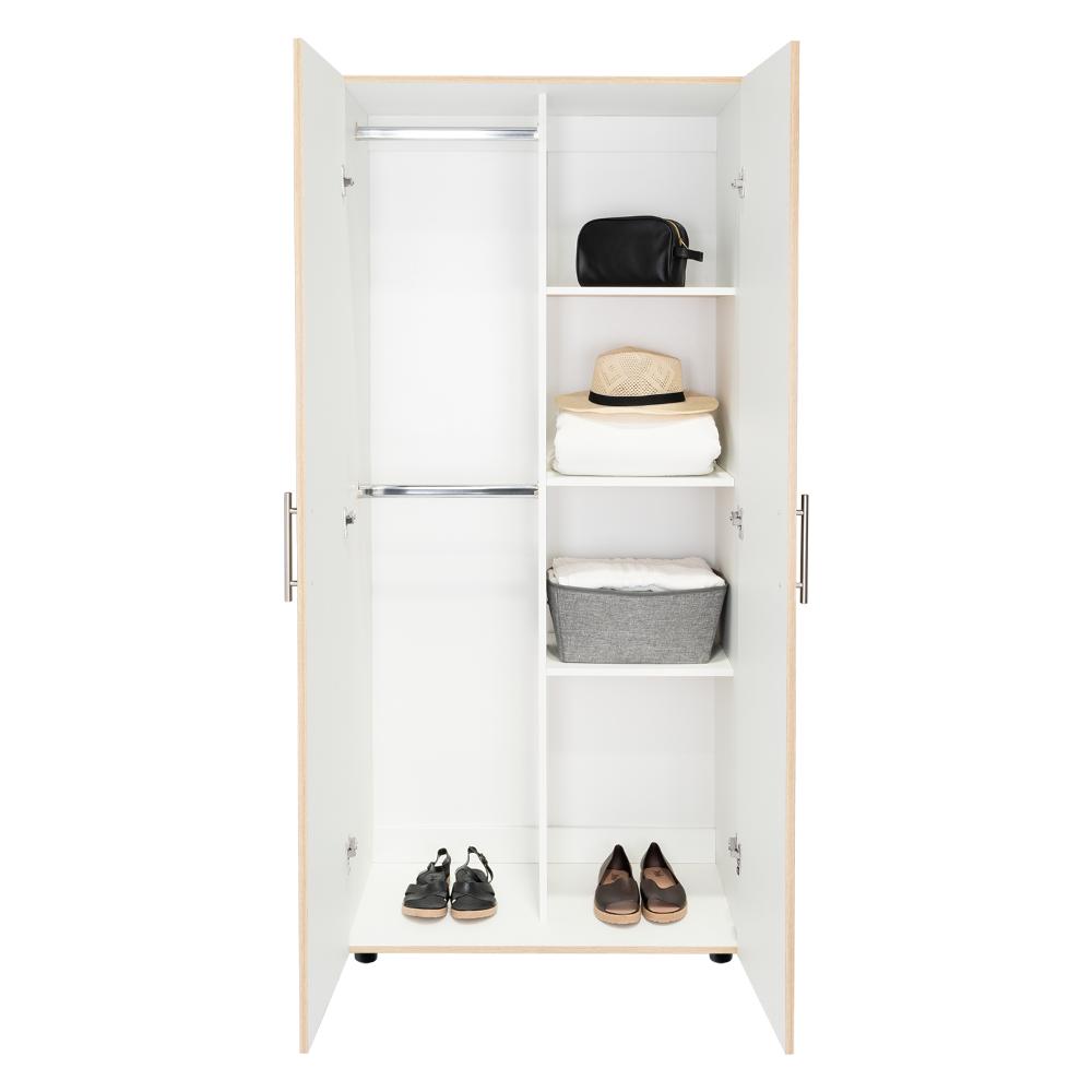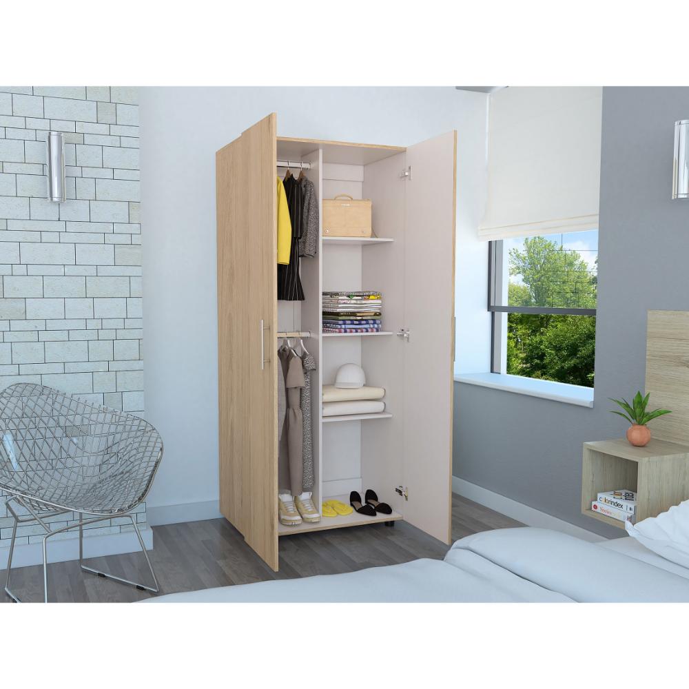 Closet, con 2 puertas abatibles, 2 tubos para colgar prendas, y 3 entrepaños para organizar.