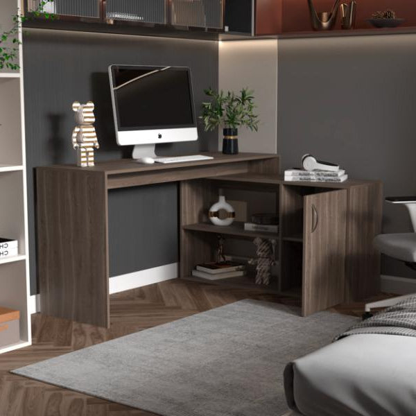 Escritorio en L, con espacio, puerta batiente para almacenar libro u otro, y