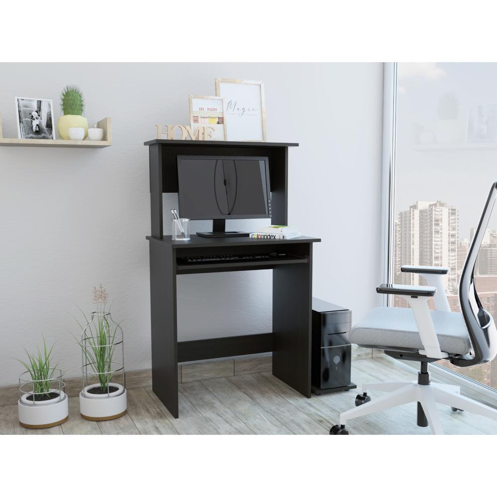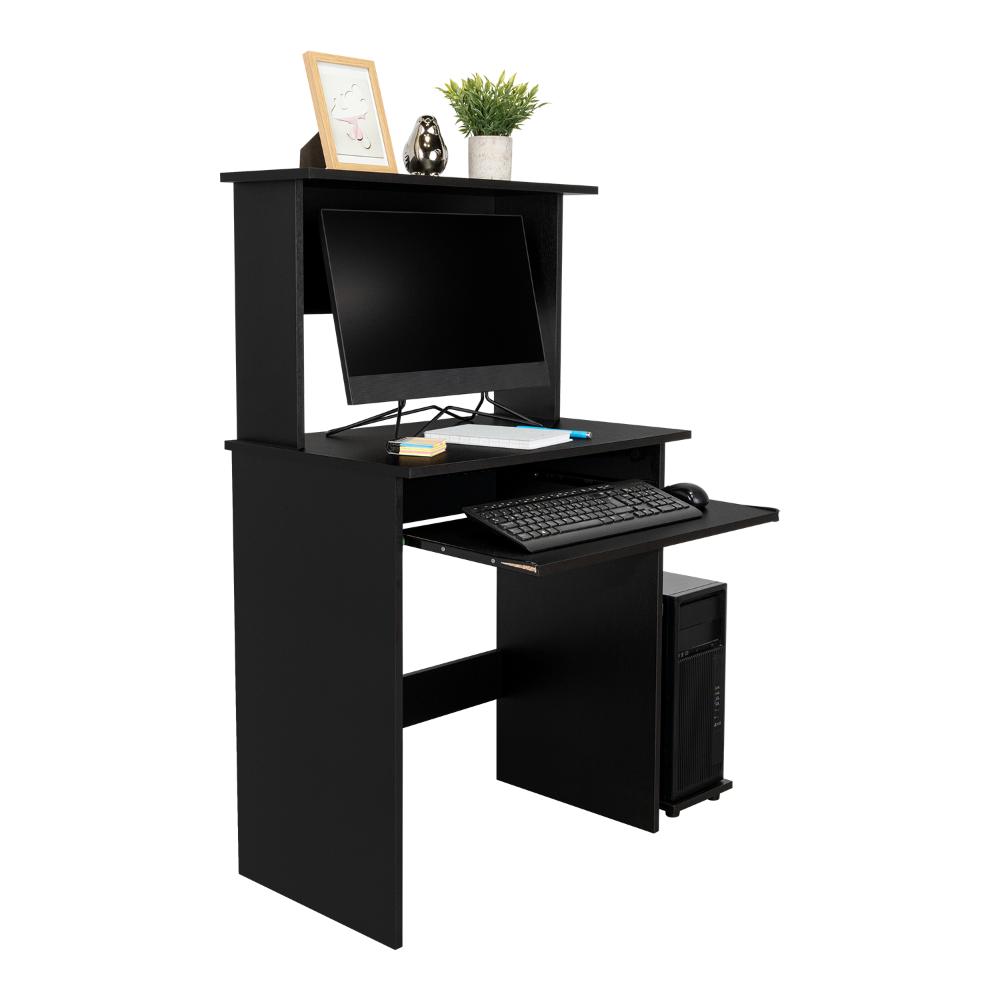 Escritorio, para PC con pantalla hasta 19”, porta teclado con rieles metálicos, espacio para objetos de entretenimiento y estudio y plataforma móvil para CPU.