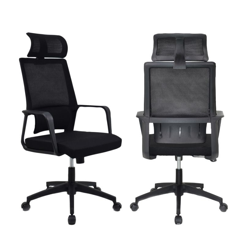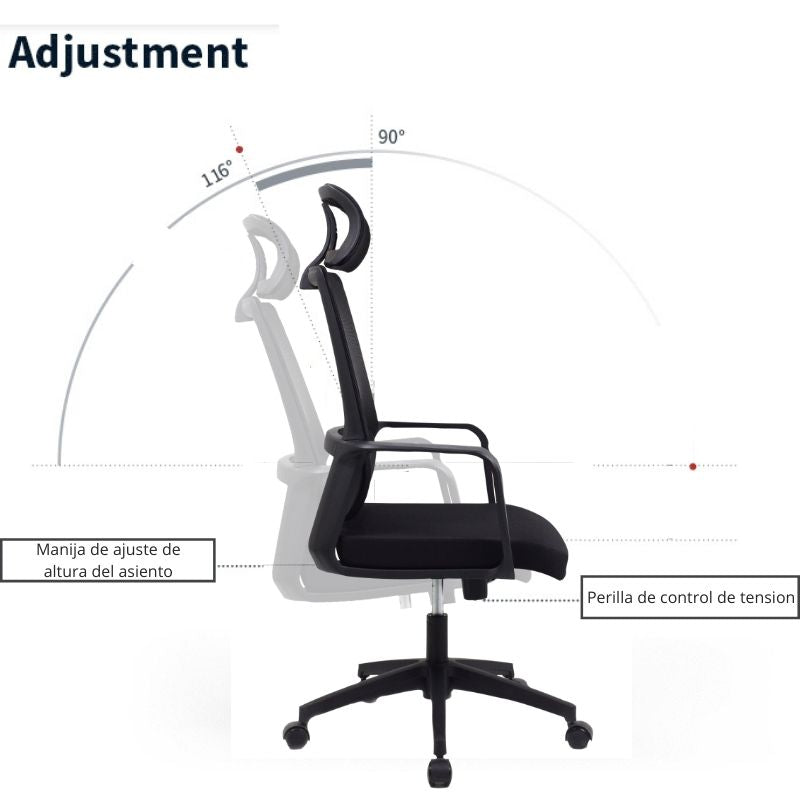 La silla de oficina ergonómica presidente es ideal para espacios de trabajo que requieren comodidad y soporte. Cuenta con un espaldar alto con marco en polipropileno de alto impacto, tapizado en paño malla traslúcido, asiento en espuma de alta densidad tapizado en paño y reposacabezas fijo. Su mecanismo basculante permite bloquear la posición vertical, con ajuste de tensión mediante perilla y elevación a gas activada por palanca. Incluye brazos fijos en polipropileno, base giratoria y ruedas en nylon de alta resistencia, ofreciendo funcionalidad y confort durante la jornada laboral.