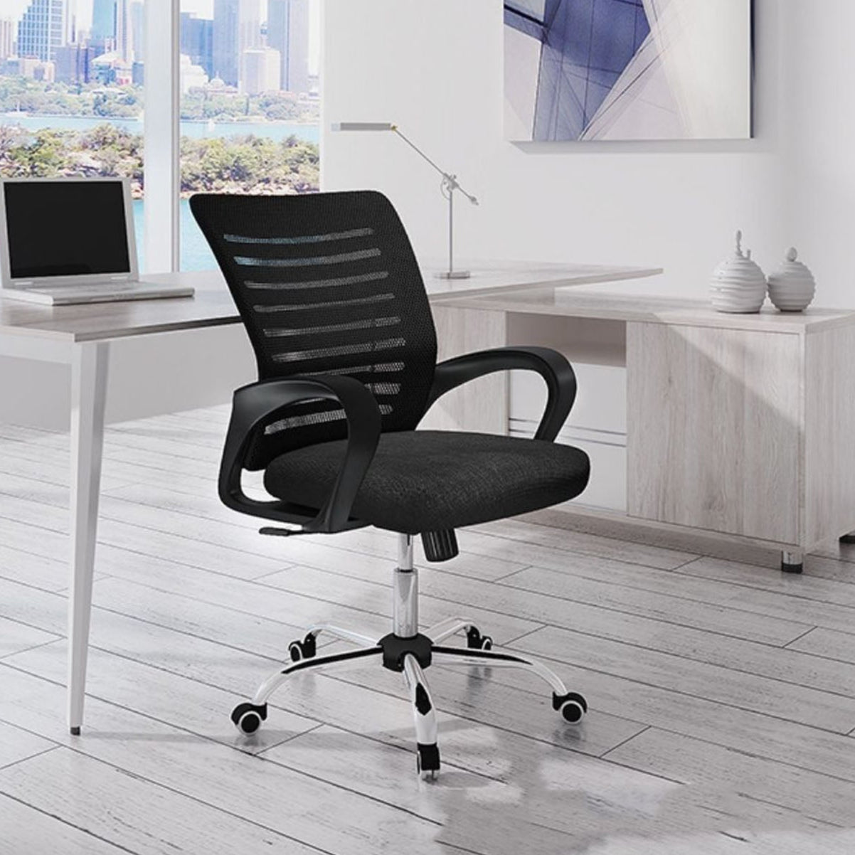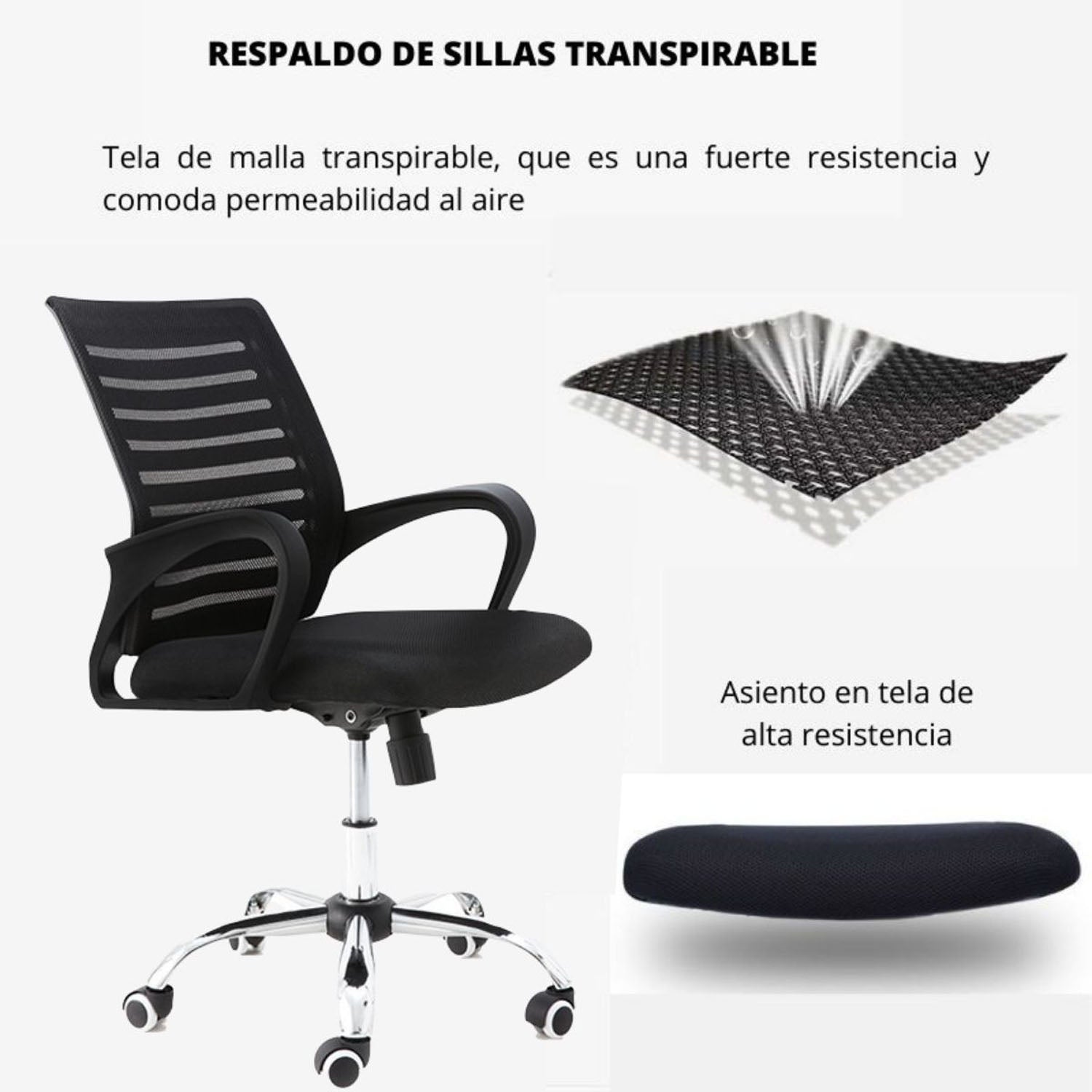 La Silla De Oficina Line cuenta con espaldar alto inyectado en polipropileno y tapizado en malla poliéster, que brinda soporte y ventilación. El asiento está elaborado en espuma inyectada y tapizado en paño, ofreciendo una superficie cómoda y resistente. Incorpora un mecanismo basculante con una posición de bloqueo a 90° y regulación de tensión mediante perilla, además de neumático con elevación a gas para ajustar la altura. Su base cromada aporta estabilidad y estilo, complementada con ruedas de nylon de 60 mm para un desplazamiento suave. Los brazos son fijos, inyectados en polipropileno, asegurando firmeza y durabilidad.