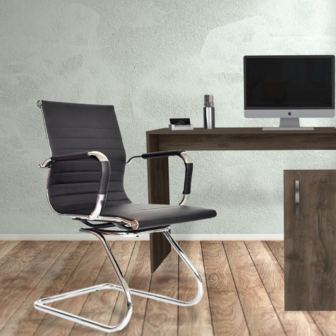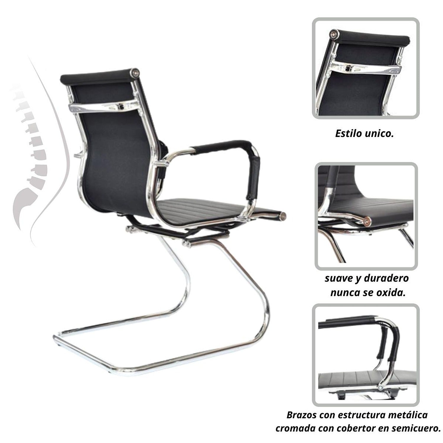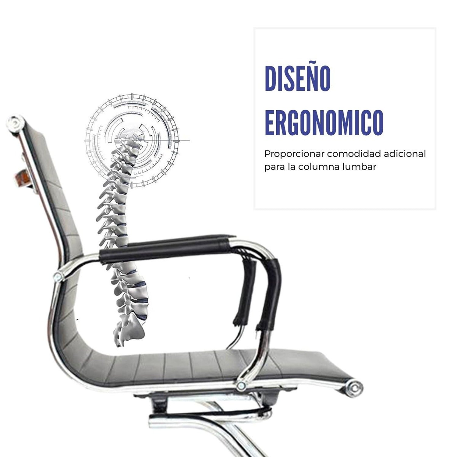 Silla de oficina tipo presidente con espaldar alto y diseño ergonómico. Cuenta con marco perimetral en metal cromado, tapizado en cuerina tanto en el espaldar como en el asiento, brindando comodidad y un acabado elegante. Los brazos tienen estructura metálica cromada con cobertor en semicuero para mayor confort. Incorpora mecanismo basculante, base cromada de 64 cm y ruedas de nylon de 50 mm que permiten un desplazamiento suave y silencioso. Ideal para espacios ejecutivos.