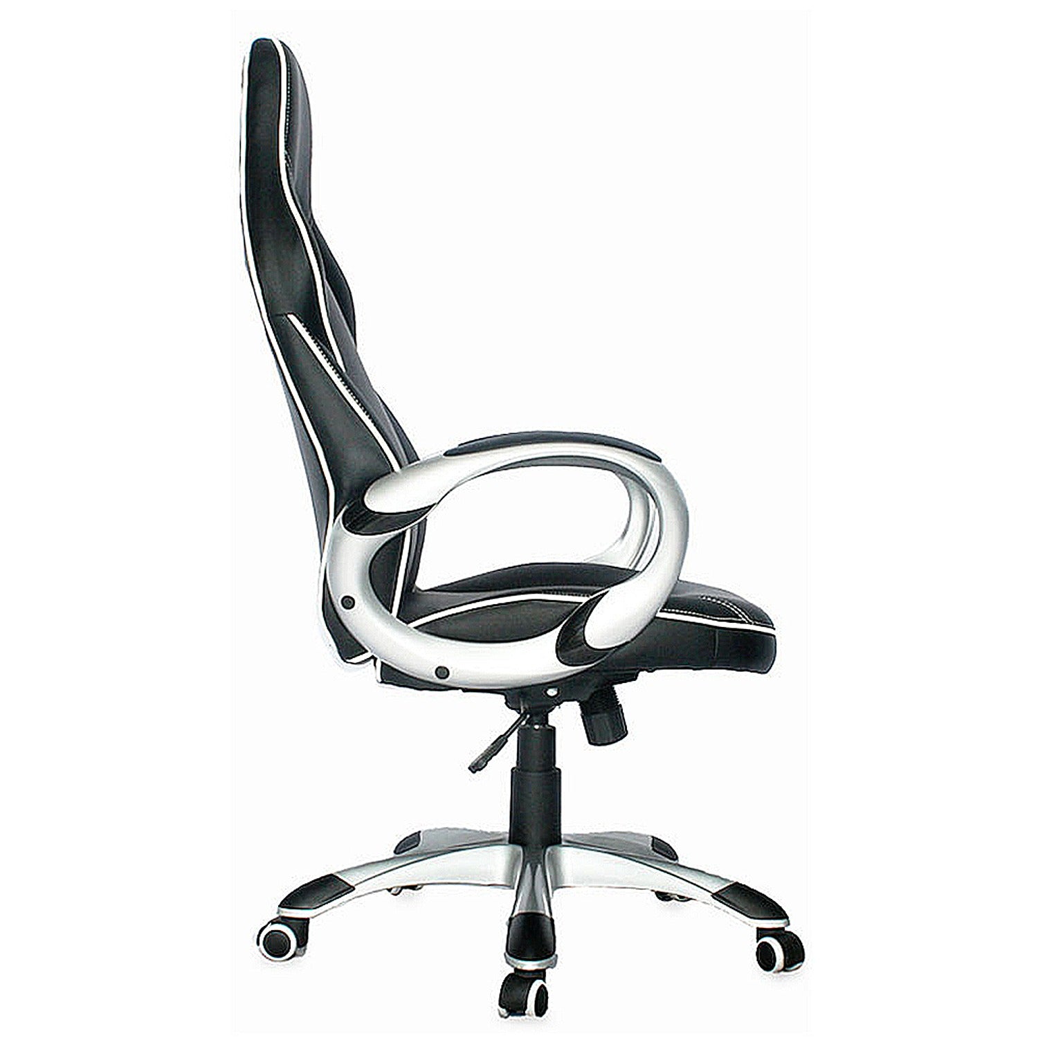 Silla Gamer premium ergonómica con espaldar alto. Espuma de alta densidad tapizada en pranna negra y terminación con detalles azul y rojo. Sistema giratorio que permite bloquear para fijar posición. Asiento abullonado en espuma de alta densidad tapizada en pranna negra. Graduación de altura mediante palanca que activa el mecanismo del neumático. Neumáticos con elevación a gas; con ruedas en goma azul para piso duro de suave rodamiento e inmediata respuesta a cambio de dirección. Brazos fijos con cojines acolchados tapizados en pranna negra. Patas en nylon reforzada con fibra de vidrio con 5 patas de 64cm brillantes. Elevación Max: 105 cm. Elevación Min: 97 cm. Material de la estructura: Nylon. Material del tapiz: Cuerina. Altura del asiento: 48cm.