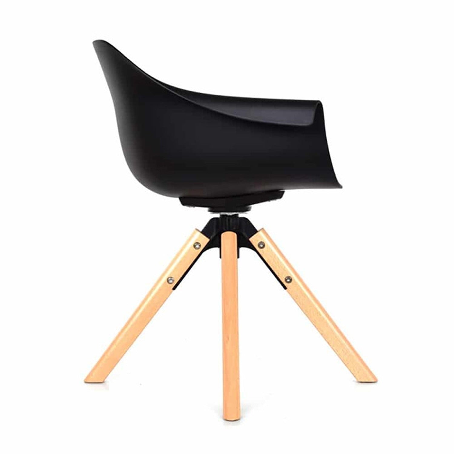 Moderna silla italiana, ideal para complementar tus espacios aportando un toque único y especial. Silla Giratoria con asiento en polipropileno con base en madera tipo pirámide.