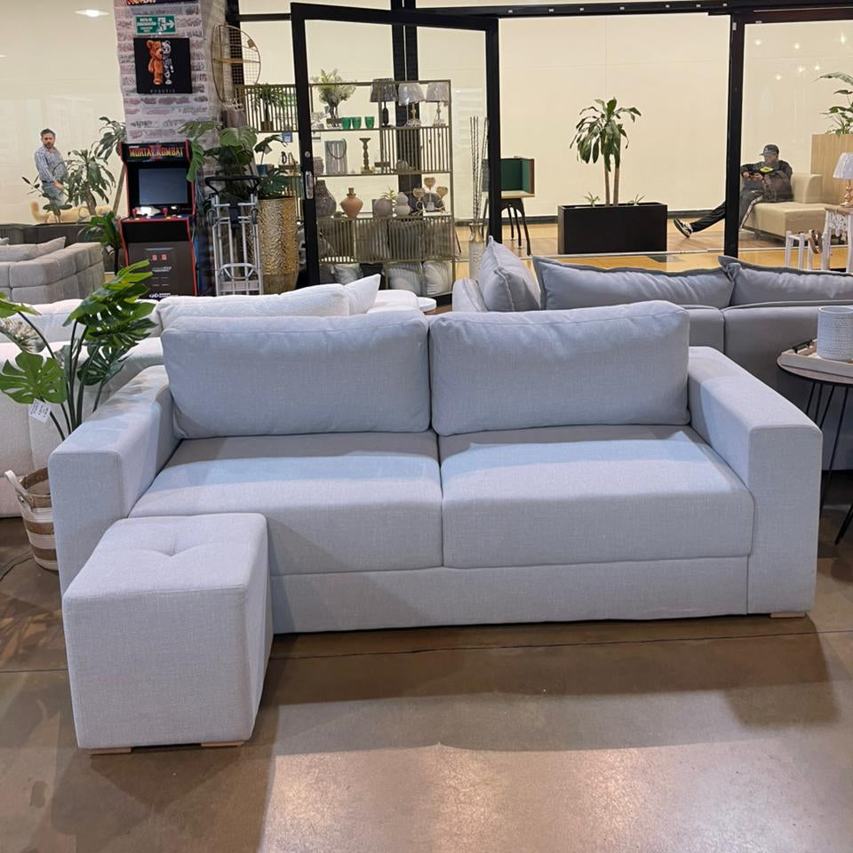 Cuenta con asientos acolchados con costuras decorativas, respaldo cómodo y firme, ofreciendo un excelente balance entre soporte y confort. Tapizado en tono gris neutro, fácil de combinar con distintos estilos de decoración y ambientes.